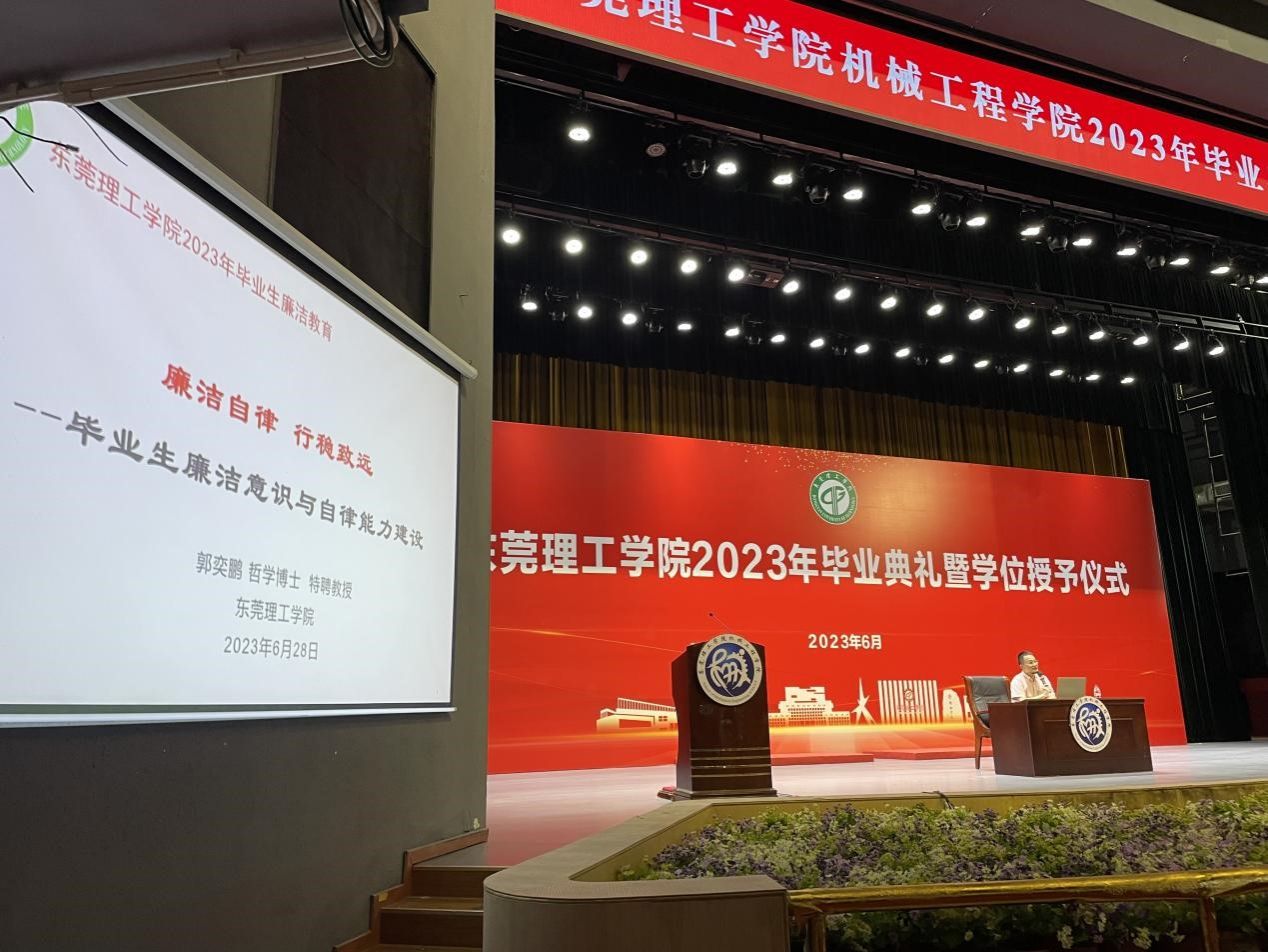 为加强毕业生廉洁教育,扣好大学毕业生走好人生路的“第一粒扣子”,2023年6月28日下午,公司在松山湖校区大礼堂组织开展2023届毕业生廉洁教育,邀请公司马克思主义公司副经理、特聘教授、公司廉洁讲师团成员郭奕鹏为毕业生讲授大学的“最后一课”。公司领导班子、辅导员、毕业班班主任代表、全体2023届本科毕业生出席活动。
