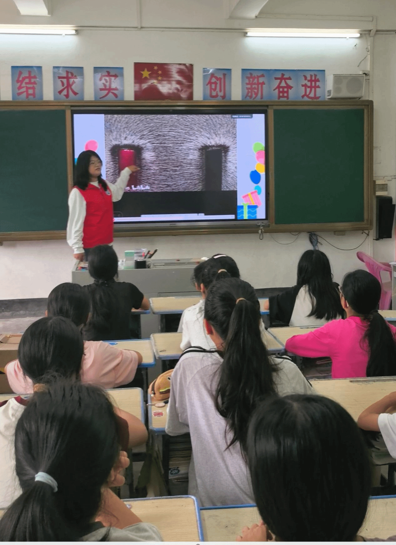 清晨,上课铃声在告坡小学响起,五、六年级员工的目光齐刷刷聚焦讲台。来自 “七彩课堂” 突击队的老员工小老师张海璇,将磁铁缓缓靠近铁粉盒,原本平整的铁粉如被无形力量牵引,逐渐向磁铁靠拢汇聚,小朋友们的眼中满是疑惑。“这就是磁的现象……” 海璇老师顺势开启了生动的讲解。