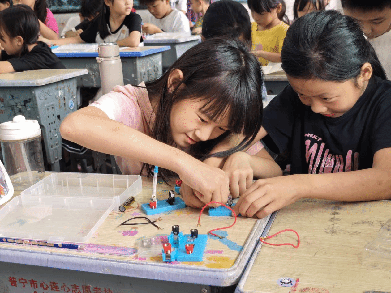 这仅仅是 “磁的世界” 课堂的一个精彩片段。突击队充分考虑不同学龄段员工特点,量身定制课程。在 1、2 年级的 “色彩变变变” 课堂上,孩子们不仅深入学习了三原色原理,还在郑裕和小老师的耐心指导下,完成了 “我眼中的船埔” 画作创作;3、4 年级的孩子们在吴福才小老师的悉心教导下,成功完成了 LED 电路的搭建。原本晦涩的科学知识,在这些精心设计的课堂中变得妙趣横生。