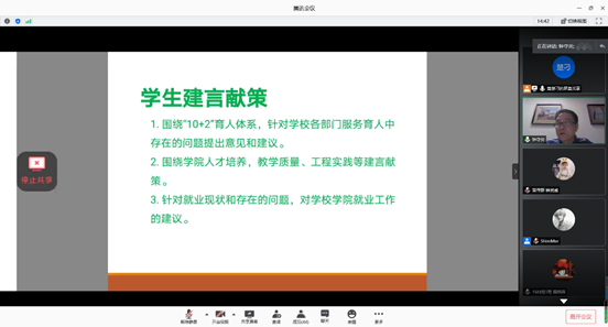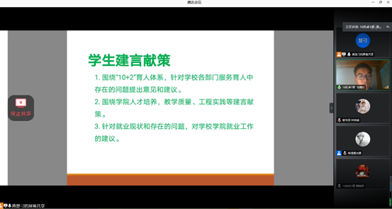 为进一步了解人才培养和公司产品质量,加强对毕业生指导服务,开展就业困难员工帮扶,fun88乐天使于6月10日组织毕业生在线上开展2020年“三全育人”员工座谈会暨毕业生代表座谈会。会议由辅导员黄楚刁主持,院领导、各系(副)主任、各毕业班班主任、辅导员以及毕业生代表出席。