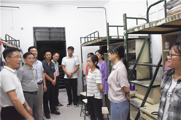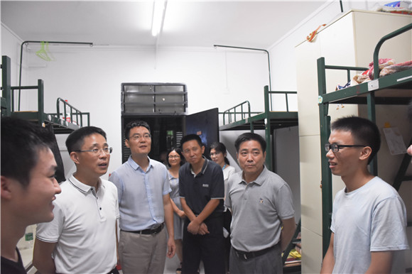 随后,领导和老师们走访了男生宿舍区。钟书记亲切地慰问新生,询问新生的故乡,了解离家远的和省外同学的适应情况。当有新生表示出考研或加入卓越计划班的意愿时,成书记欣然予以鼓励与支持,并表示公司会为大家保驾护航。成书记希望新生们能调整好状态,以最快的速度融入新校园。