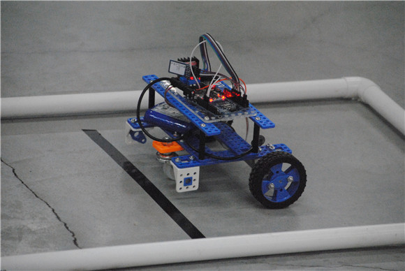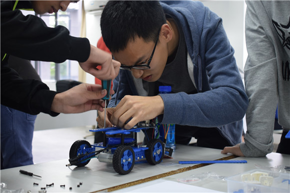 在经过两轮的培训之后,同学们对比赛规则和流程有了详细了解,并做好了充分的准备。比赛当即,同学们在等候室中就已经开始摩拳擦掌、跃跃欲试。等待工作人员清点完设备和零件,竞赛的第一阶段正式开始,参赛者们开始拼装用于第二阶段的小车。比赛如火如荼的进行着,同学们分工明确,有人负责拼接电路,有人负责拼装小车,井然有序地完成自己组的小车。时间过了三十分钟,就已经有小组完成自己的小车了,在工作人员检查完电路并领到电池后,便开始用手机调试小车。在确认无误后,就能进入第二阶段的比赛—操控竞速赛。参赛选手们要运用自己拼装好的小车,用手机操控通过障碍赛道。为了保证比赛公平性,我们采用超声波计时器以减少成绩的误差。在参赛者操作过程中,有人稳扎稳打,平稳地通过了赛道,愉快结束比赛,有人出现意外失误,冲出赛道,抱着遗憾退场,也有少部分小组没能在规定时间完成小车,惨遭淘汰。