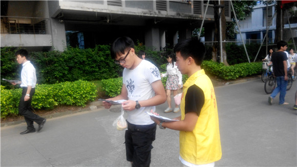 上午10点左右,两名志愿者预先赶到招新地点,熟练地撑开了帐篷,张贴宣传照片,紧锣密鼓的装饰帐篷。不久之后,上一届七彩课堂的队长恒举师兄赶到招新地点参与招新准备工作。到了中午,剩余的几位志愿者风风火火的赶到了招新现场,迅速的投入到了预先安排好的任务之中。中午,一直是举行各种活动的黄金时段。路边来来往往的行人,不断有同学被志愿者精心打扮的宣传摊位吸引过去,不一会,摊位前就挤满了前来咨询的同学,报名人数不断增加。截止到下午4点,报名人数已经远远超过预计。临近傍晚,志愿者们又拿出了许多宣传单,分别到各个路口分发传单,充分利用晚餐时间这最后的人流高峰期,再次拉来了数十名报名者。在这最后的高潮之后,此次招新活动终于告一段落,迎接这些报名者的,将会是严格的面试筛选。