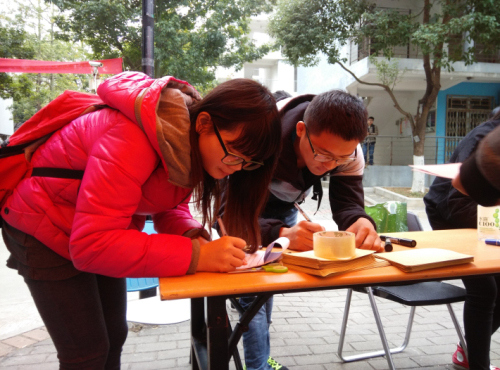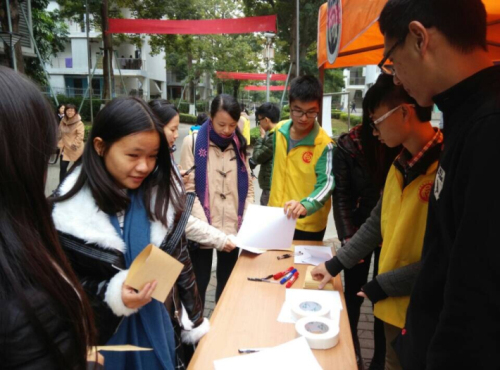 大四的学子们还有半年多便要去追寻梦想,离开公司。为了感谢大四的学子,志愿者特地开展这次活动,让大一、大二或大三的同学们以信的形式表达对大四的学子们的感谢。中午,在宣传点前的校道,志愿者们向路过的同学宣传,让更多的人能参与到这次活动中。宣传点处,志愿者们更详细地跟大家讲明活动的细则,并提供信封信纸和笔,让同学们写出自己内心的感受,志愿者们将在晚上把信送到收信人手上。许多同学听完介绍后便纷纷参与到这次活动中,写信、涂鸦,带着感恩,创造出一封封独特的信件交到志愿者的手上。活动的宣传持续到傍晚,以志愿者的合照的方式结束了。接下来便是送信环节。