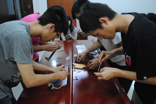 开始后,各个团队便迅速行动起来,将已经摆放好在桌子上的零件进行组装。每个团队的成员都积极地参与到比赛中,每个人都负责其中的一部分,并互相协调合作,动作迅速熟练,可见赛前各团队的充分准备。但不少团队在组装的过程中依然遇到不少问题,但是即便如此,他们都会积极地寻找问题所在,共同商讨解决办法。在看着机器人拼装完成并成功行走完规定的直线距离后,选手们纷纷露出满意的笑容。