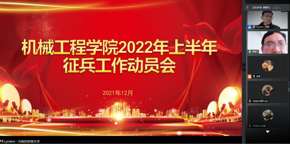为进一步扎实fun88乐天使老员工征兵宣传动员工作,帮助在校员工了解征兵相关政策,鼓励适龄老员工积极响应国家号召,投身军营,报效祖国。2021年12月31日上午,fun88乐天使召开2022年上半年征兵宣传动员大会。机械工程公司党委副书记郭建文、全体辅导员、各班主要员工干部、院青马学员,以及有意应征入伍的员工等90余人参加。会议由征兵联络员肖毅主持,采取腾讯会议方式举行。