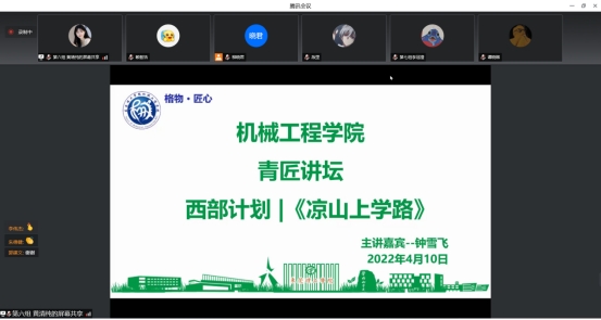 2022年4月10日,公司在腾讯会议线上举办《青匠讲坛》活动,邀请广东省百蹊教育基金会钟雪飞老师、陈彦澄老师和郭钦源老师为“青马班”学员讲授“西部计划|《凉山上学路》”为主题的讲座。机械工程公司党委书记郭建文、团学指导老师郭家润及青马班全体成员参加活动。