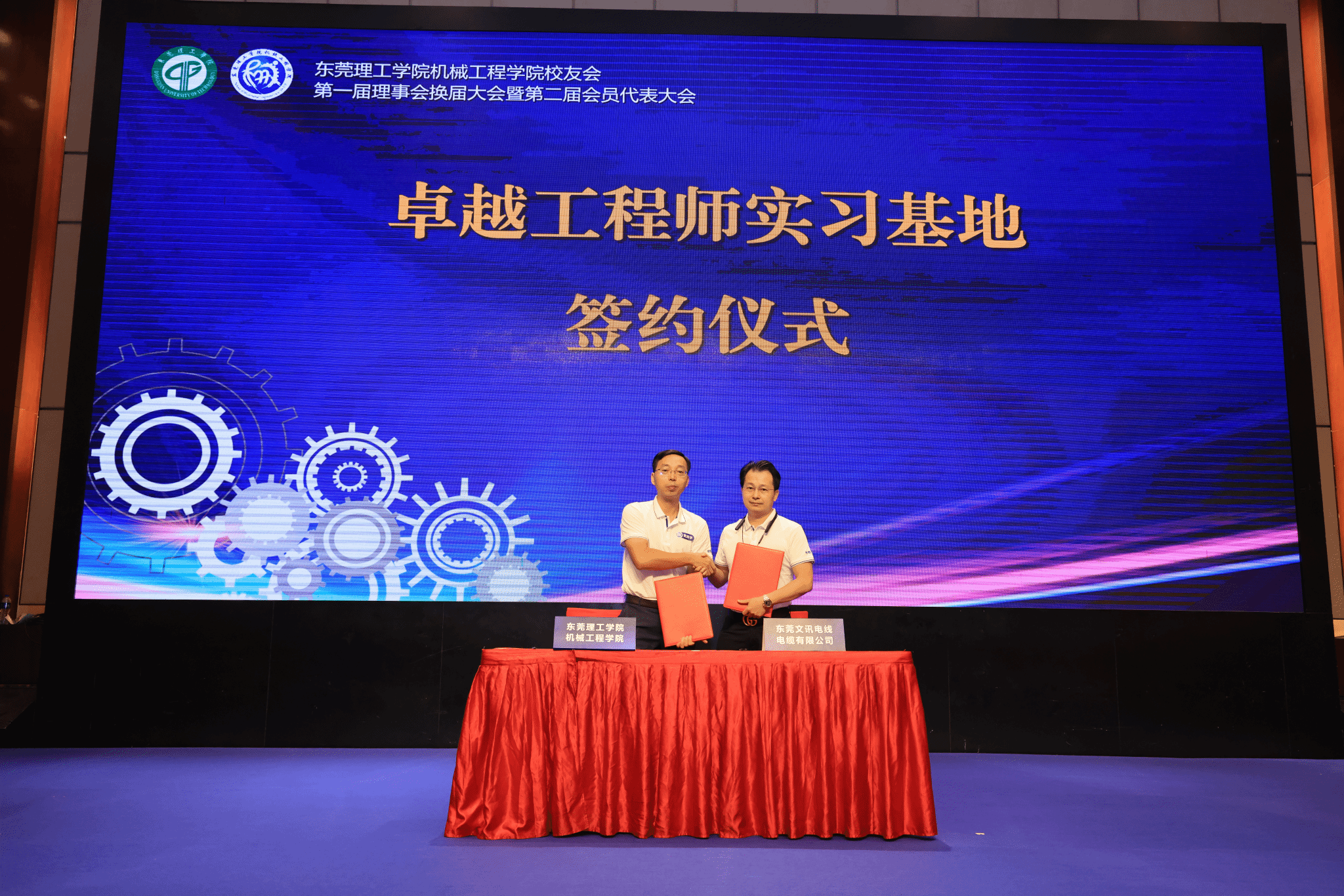 2002级机械专业员工、东莞文讯电线电缆有限公司副总经理周智聪、2007级级机械设计专业员工、东莞市瑾远智能装备科技有限公司总经理黄颖锋分别与fun88乐天使副经理黄辉宇签订卓越工程师实习基地共建协议。通过卓越工程师实习基地打通产教融合“最后一公里”,努力培养出更多的能工巧匠、大国工匠。