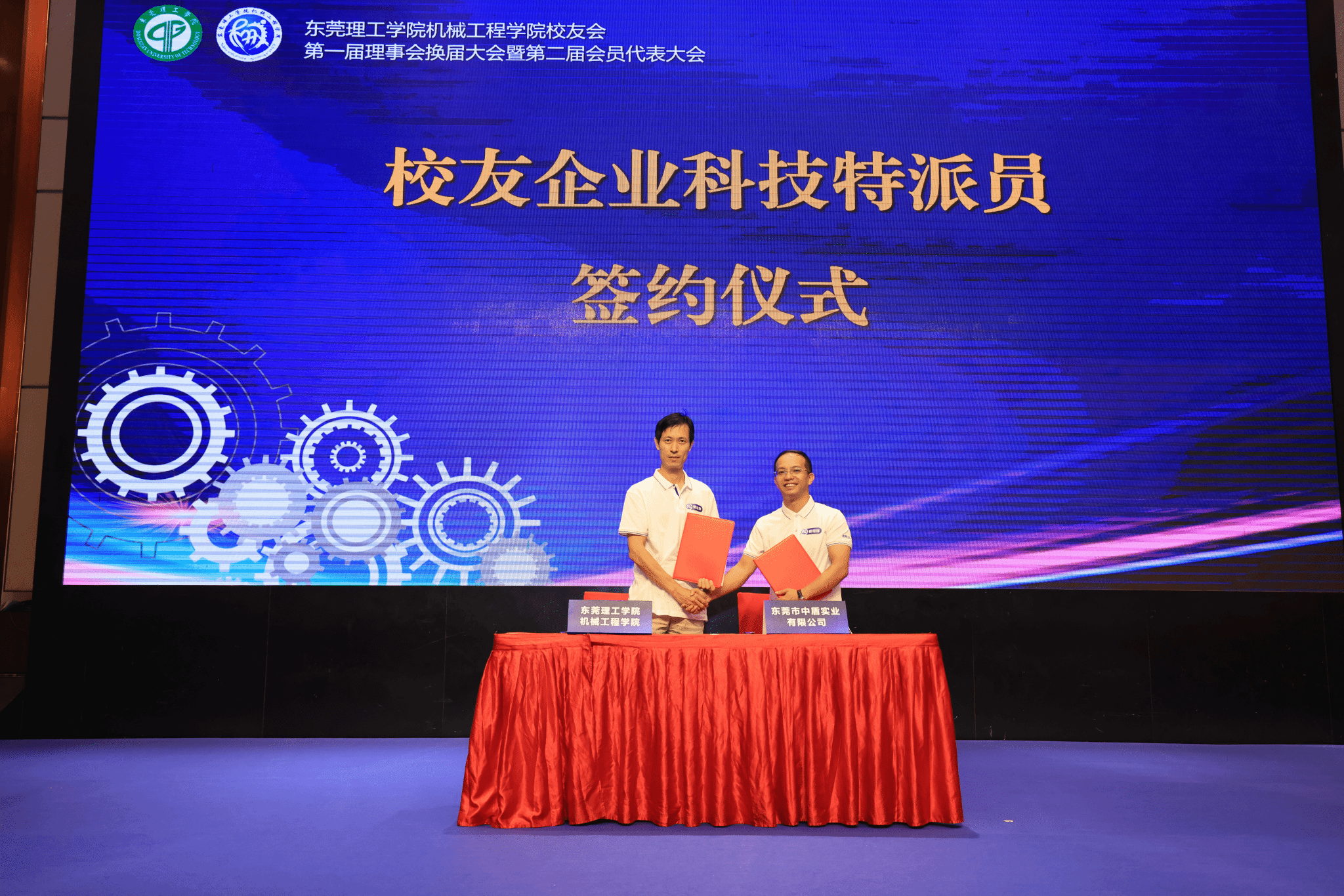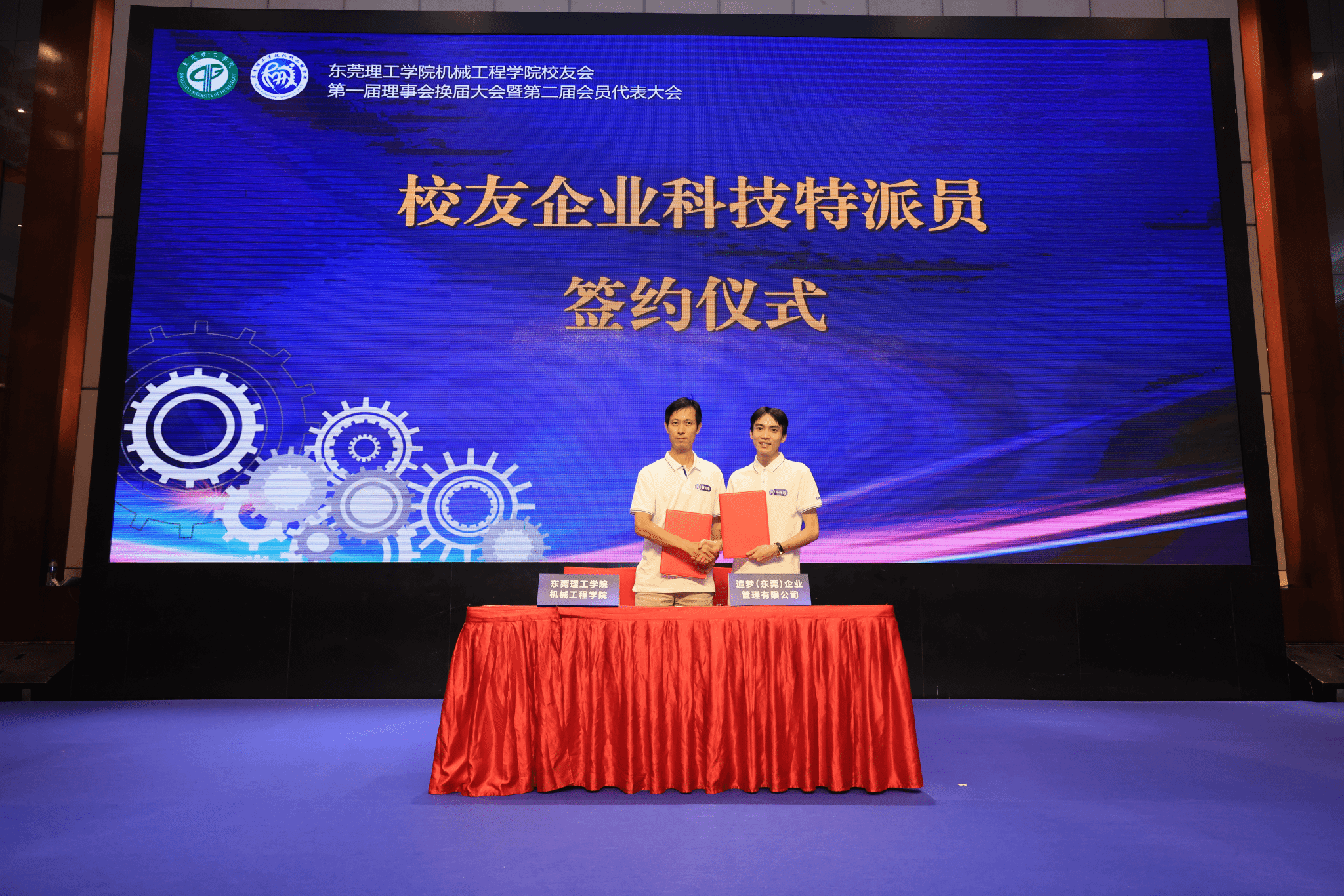 2010级工业设计专业员工、追梦(东莞)企业管理有限公司总经理许梓河,2004级工程管理专业员工、东莞市中盾实业有限公司总经理崔明辉代表员工企业与公司副经理曾达幸签订一博士一员工企业科技特派专员协议。进一步完善公司科技特派员服务支撑体系,提升科技特派员的组织效能和服务成效,切实提高科技服务水平和科技创新创业能力。