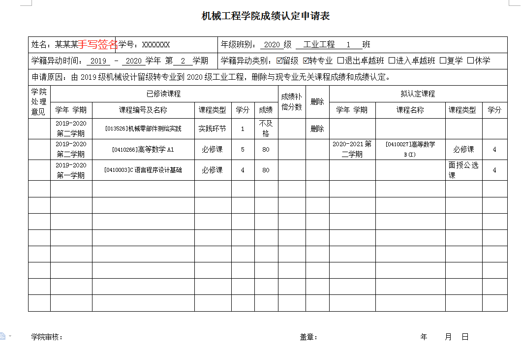 填表举例:(已修读和拟认定的课程如果课程编号一样则不用填表,系统自动认定;只填需要人工处理的课程。低学分、低要求课程不能认定到高学分、高要求课程。)