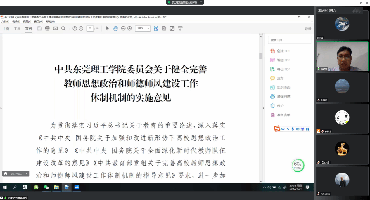 2022年12月1日,fun88乐天使通过线上方式召开全体教职工会议,全院教职工参加会议,会议由公司党委书记郭建文主持。