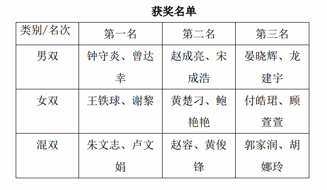 经过激烈的角逐,比赛男双冠军由钟守炎、曾达幸夺得;混双冠军是朱文志、卢文娟;女双冠军为王铁球、谢黎。具体获奖名单如下: