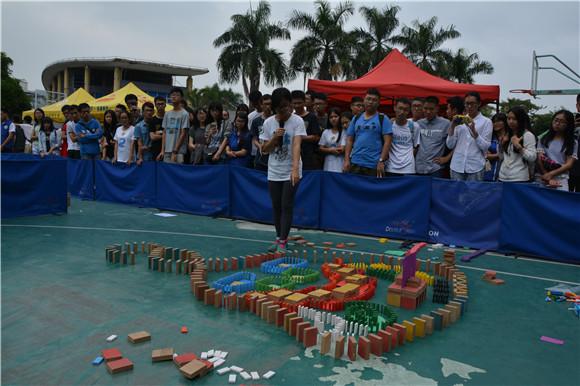 本次决赛分两轮,每轮5个小组进行比赛。比赛开始,主持人介绍出场嘉宾并宣读小组队名。各小组进场后,开始时限30分钟的骨诺牌图形设计。每个小组的图形各具特色,许多小组都以他们的设计来表达自己对公司的爱意。其中第一组用骨诺牌摆出一个小型fun88乐天使莞城校区,这显示了15级新生对公司的热爱。还有第七组以“DGUT”图形构成小房子,并用骨诺牌摆出马里奥的图形,加上他们的演讲,引得观众掌声连连。今天的比赛并不是每个小组都按时完成的,第6小组的参赛人员,他们的设计因现场的微风不断而屡次倒下。但最后在图形讲解和老师点评的提前下,他们还是重新完成了作品,完成了比赛。在两轮比赛结束后,开始了分享环节,参赛人员各自分享自己的参赛感想,精彩之处,掌声不断。