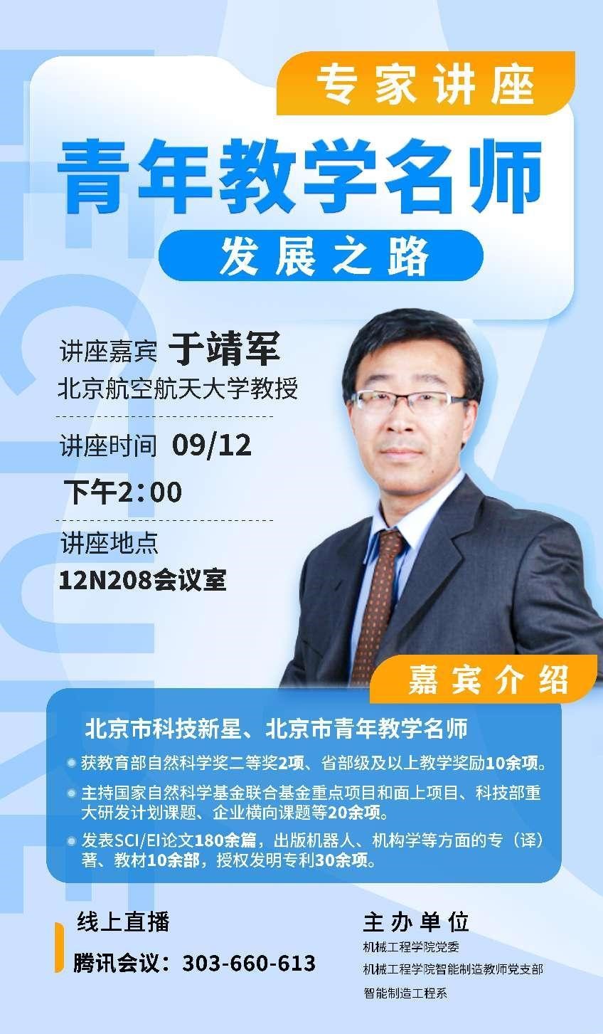 接下来,北京市科技新星、北京市青年教学名师、北京航空航天大学于靖军教授,通过线上为全体教师带来了题为“青年教学名师发展之路”的专家讲座。于教授分享了他对于教学名师成长的深刻见解和个人经历,报告涵盖了教学基本功、教学学术和教学名师三个层次。于教授首先详细解读了成为教学名师的条件和路径,强调了教学成果奖、课程获奖、团队获奖、教材获奖和指导员工获奖等教学成果的重要性,为教师们提供了明确的目标和方向。他还结合个人的学术旅程以及MIT访学经历,分享了如何将国外的教学理念和方法融入平时的教学实践中。在报告的第三部分,于教授深入探讨了教学学术的概念,认为教学学术不仅包括教学方式和方法的探索,还涉及将科研成果转化为教学内容的过程,他结合自己所讲授课程分享了基于OBE理念的教学设计,如何通过项目化教学来培养员工的创新意识和工程实践能力。