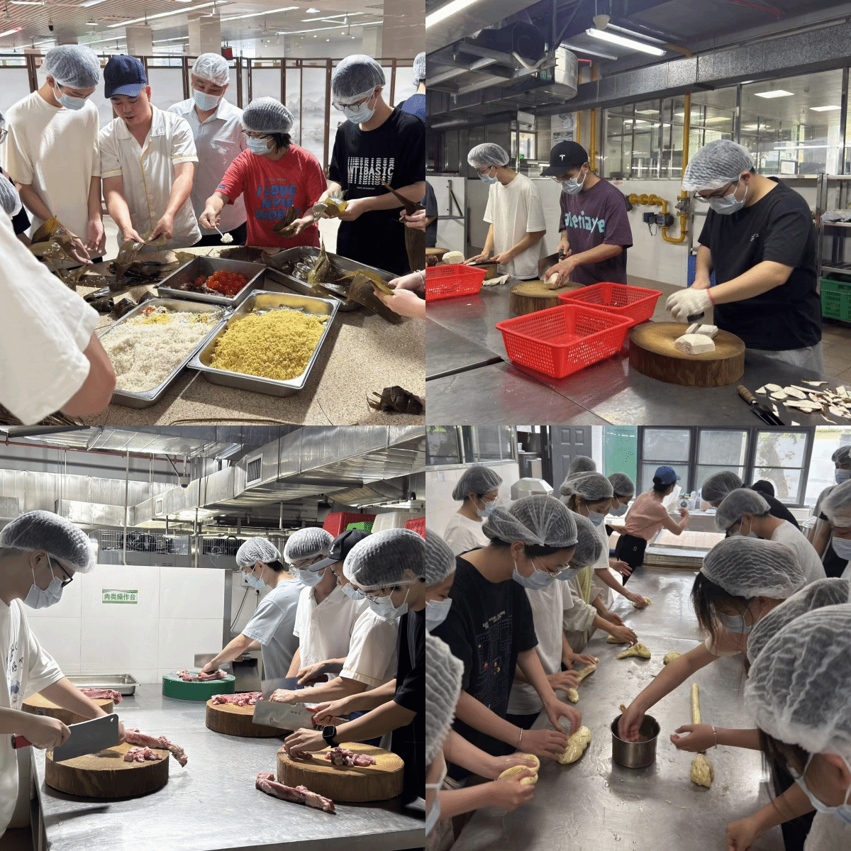 活动现场,公司第三食堂化作欢声笑语的劳动“课堂”。在食堂工作人员的悉心指导下,同学们将糯米、绿豆、咸蛋黄、五花肉等食材按比例填入粽叶,熟练地包裹、捆绑、串联,一个个形态各异却饱含心意的粽子逐渐成型,辅导员讲述端午节的历史渊源、民俗故事,交流各地不同的端午文化习俗,引导员工在实践中感悟中华优秀传统文化的内涵与价值;制作香芋蒸排骨时,同学们仔细挑选食材,清洗、削皮、剁切、腌制,认真处理每个步骤,将对美食的期待融入劳动之中。而在面点麻薯球的制作过程中,揉面、擀皮、切块、造型、烘焙,每一个动作都凝聚着同学们的专注与耐心。