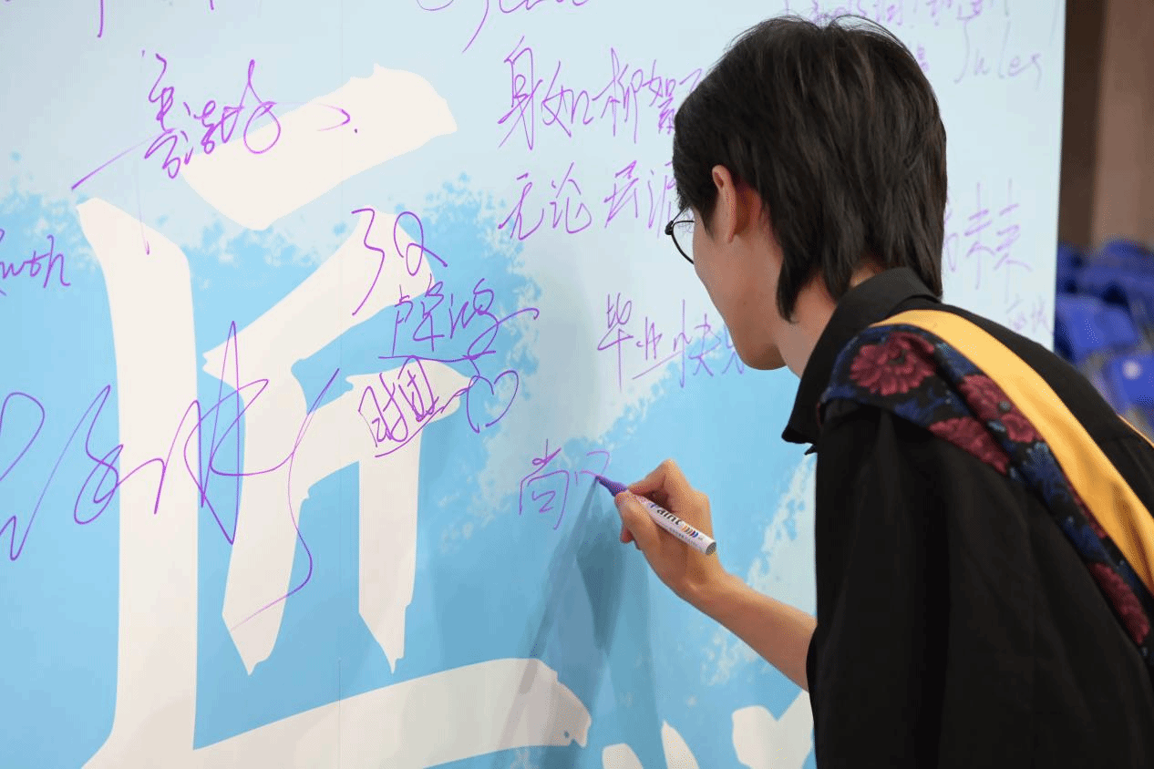 留言板上,毕业生们庄重地签下自己的姓名。一笔一划,不仅是身份的确认,更是对过往求学岁月最深情的告别与铭记。每一个签名、每一句祝福都如同一个独特的坐标,映照着他们在这片沃土上奋斗成长的足迹。密密麻麻的名字和祝福汇聚在一起,无声地诉说着一段共同的青春故事……