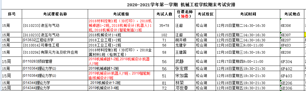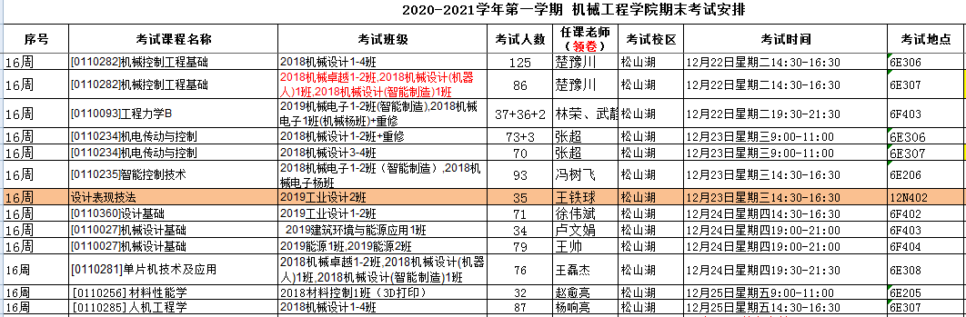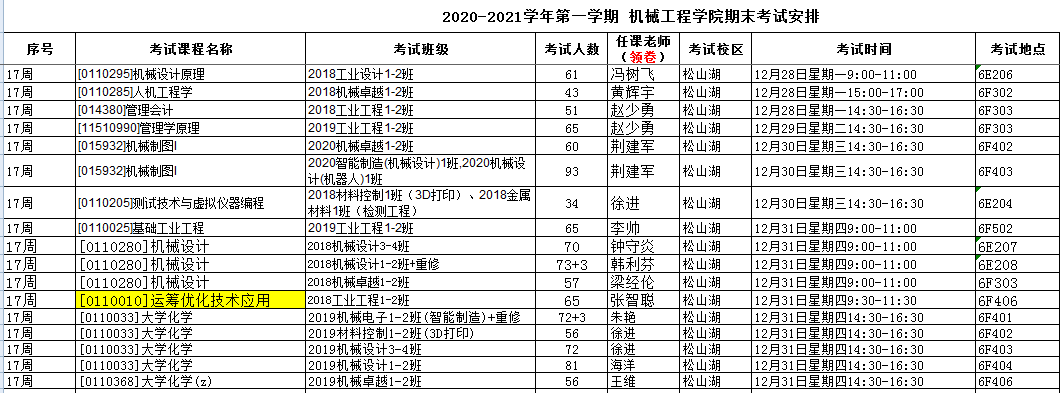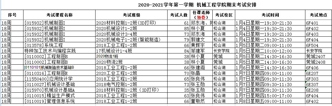 2020-2021学年第一学期期末考试安排表(松山湖统考)