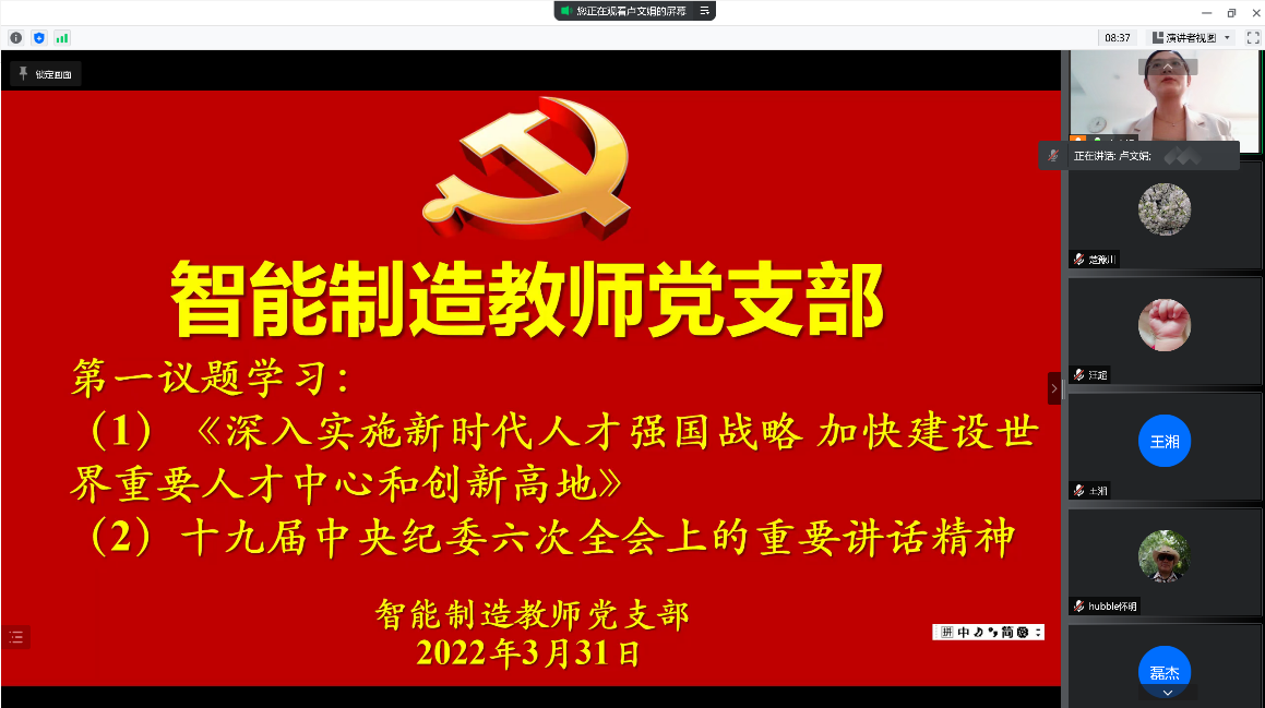 2022年3月31日,fun88乐天使智能制造教师党支部通过腾讯会议在线开展了“深化课堂教学改革,提升课程思政质量”主题党日活动,活动由智能制造教师党支部书记卢文娟同志主持,机械工程公司党委书记郭建文同志、智能制造教师党支部党员教师以及公司其他教师参加了活动。