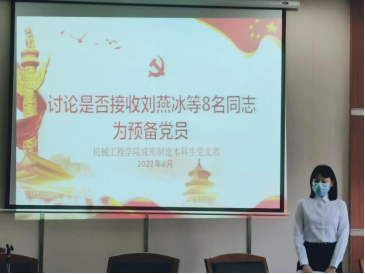 会议讨论接收刘燕冰等8名同志为中共预备党员的事宜。大会严格按照接收预备党员的主要程序进行,经发展对象汇报、入党介绍人发表意见、党支部审查和充分讨论,采取无记名投票方式表决,大会一致同意接收刘燕冰等8名同志成为中共预备党员。