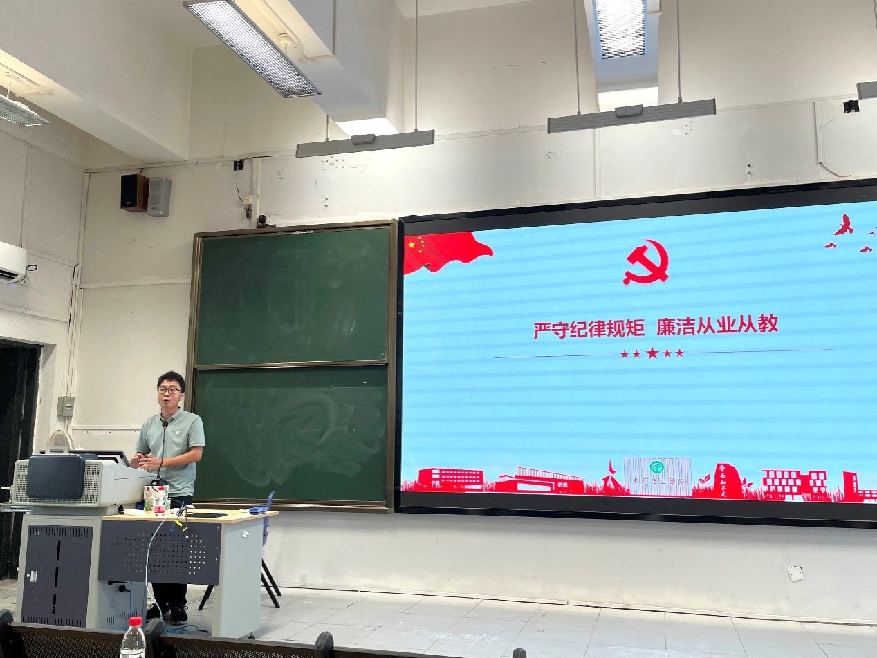 邓维伟结合教育部公开曝光第十二批教师违反十项准则的典型案例开展警示教育,邓维伟强调,师德师风是评价教师队伍素质的第一标准,同时也是一项需要久久为功的长期工作。希望各教师党支部要提高政治站位,发挥各教工党支部主体作用,在课堂教学、师生关系、学术研究、社会活动等方面体现师德师风建设工作成效。也希望广大教师从警示案例中吸取教训,加强自我约束,在教书育人、科学研究以及日常生活等方面严格要求,远离师德“红线”。