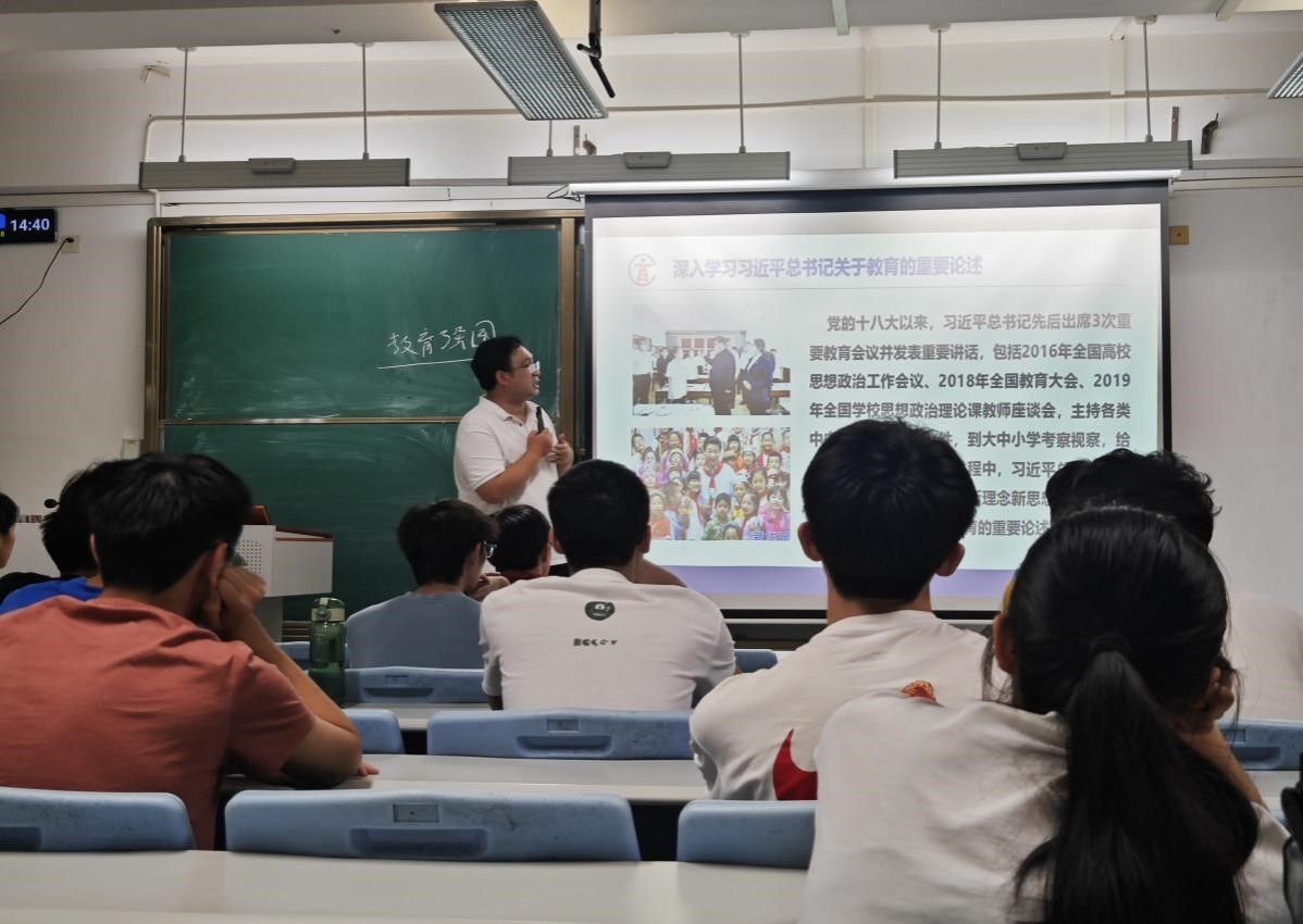 党课伊始,郭建文抛出一句“跳出教育来看教育”的话引发同学们的思考,引导员工用发展的眼光去看待和理解国家的政策和教育方针;以2018年全国教育大会上提出的“九个坚持”为切入点,深入地解释和分析了教育的首要问题是要培养什么样的人、促进教育公平、教育服务中华民族伟大复兴、深化教育改革创新、坚持把教师队伍建设作为基础工作、坚持党对教育事业的全面领导等相关问题,并以诙谐幽默的话语和生动有趣新鲜的例子,使同学们加深了对国家教育方针政策的认识。