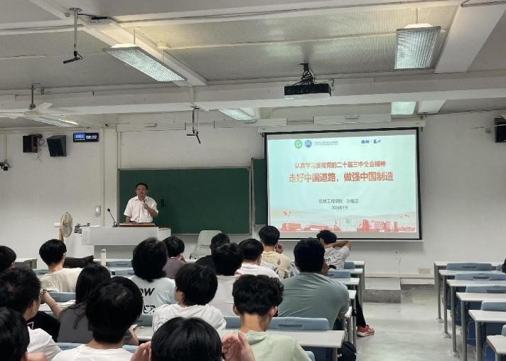 9月25日,fun88乐天使经理孙振忠以“认真学习贯彻党的二十届三中全会精神,走好中国道路,做强中国制造”为主题,为2023级机械设计制造及其自动化4班、5班和6班的本科生上2024年秋季学期思政第一课。课上,孙振忠经理强调了学习党的二十届三中全会精神的重要性,并与同学们分享了自己的学习体会和思考,提出要结合国家政策与个人专业发展深刻领悟全会精神。课上,孙振忠阐释了中国式现代化的概念,强调了推进中国式现代化建设...